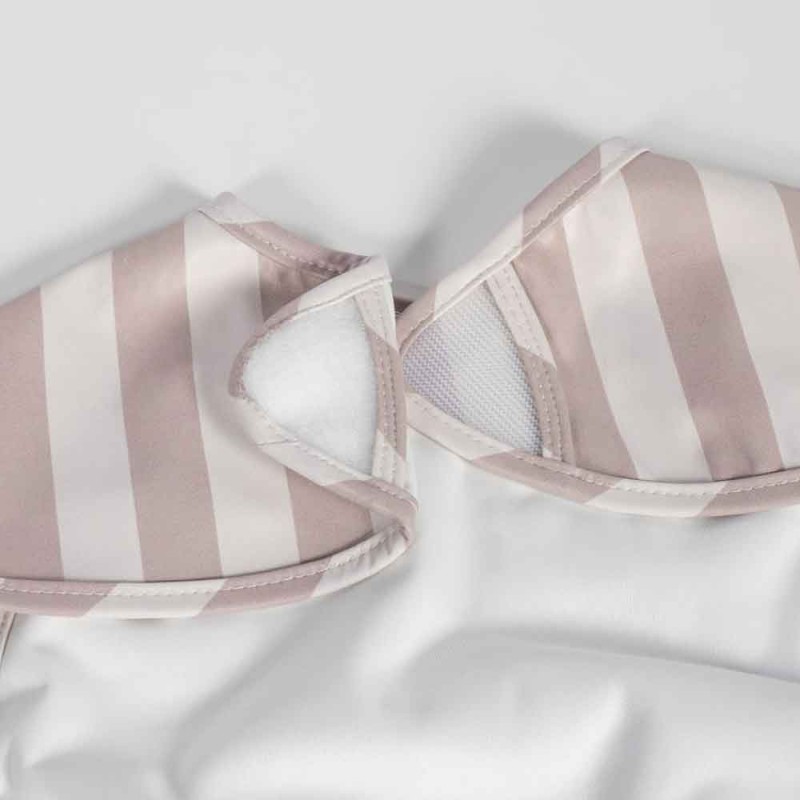 - Su diseño encantador con orejitas en relieve y estampado de rayas le da un toque tierno y divertido. Además, cuenta con un bolsillo recogemigas para atrapar restos de comida, evitando desorden en la ropa y la mesa.