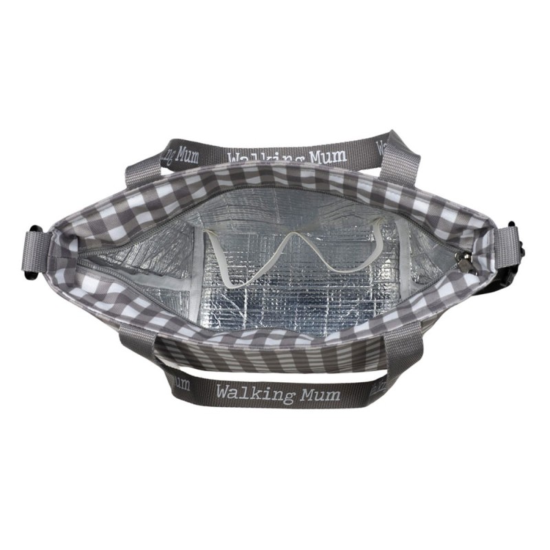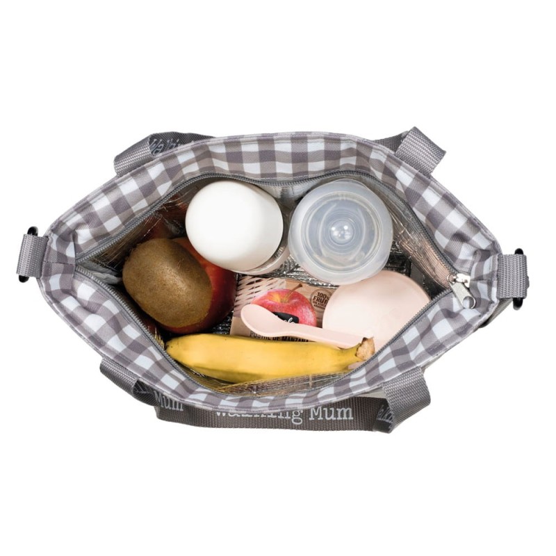 Bolsa térmica Caetana Stone de cuadros beige. Mantiene la temperatura durante 4 horas. También incorpora una asa larga para poder colgarla en el hombro y asa corta de mano.
