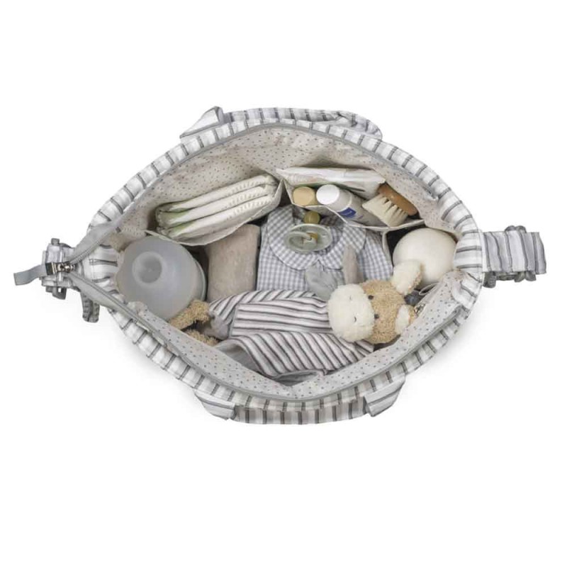 Ref: 1120800470Bolso cambiador Botton con estampado a rayas para silla de paseo que incluye cambiador para bebe. Bolsa canastilla muy ligera, resistente y de gran capacidad para llevar todo lo necesario para el paseo del bebé.