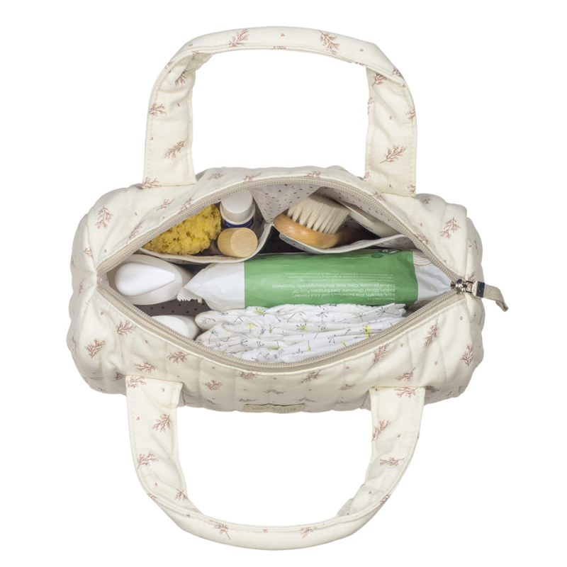Mini bag Mimosa Rosa con estampado floral. Bolsa ideal para llevar todo lo imprescindible para el paseo del bebe.
