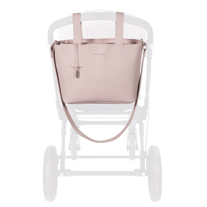 - La bolsa tiene un sistema universal de fijación, con 2 asas cortas ajustables que facilita la colocación en cualquier modelo de silla de paseo, así cómo una asa larga para poder colgarla en el hombro y asas cortas de mano.