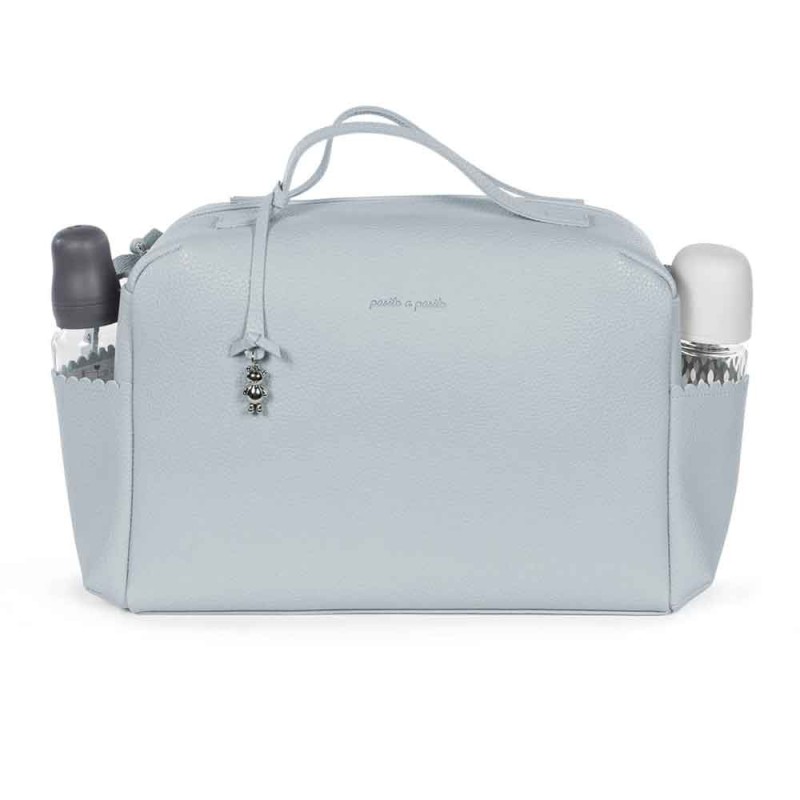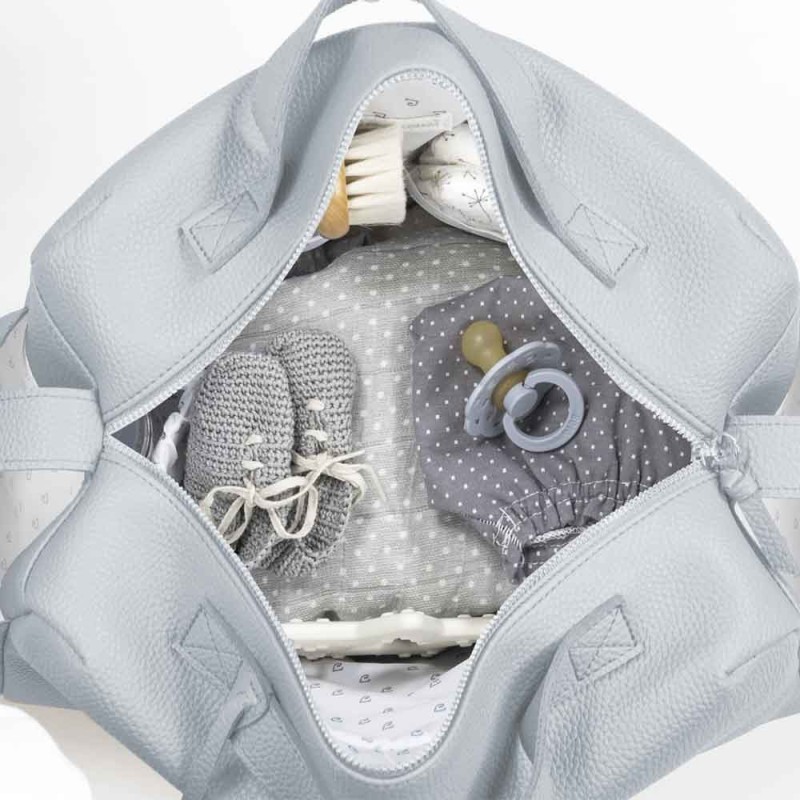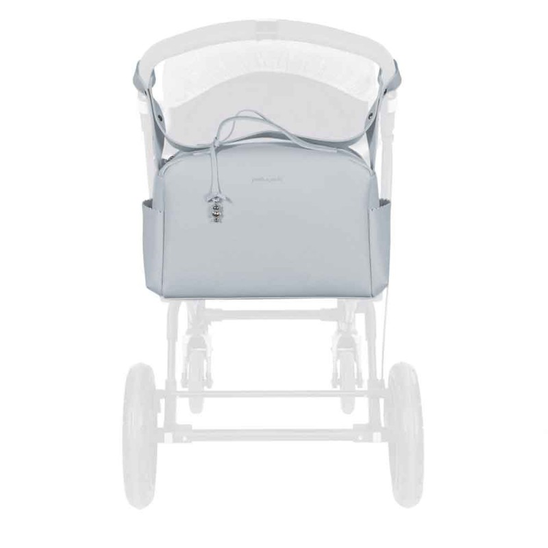 - Viene acondicionado con doble asa, una larga para colgar en el hombro y unas cortas de mano. El asa larga incorpora broches metalicos a presión para poder colgarla al cochecito.