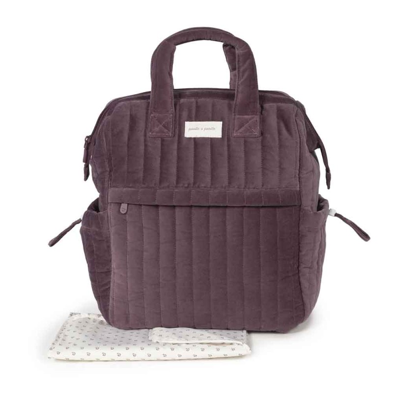 Mochila Cherry Velvet de Pasito a Pasito: elegante y práctica, confeccionada en suave tejido efecto terciopelo. Ideal para organizar todo lo necesario del bebé y llevarlo cómodamente en paseos o viajes.