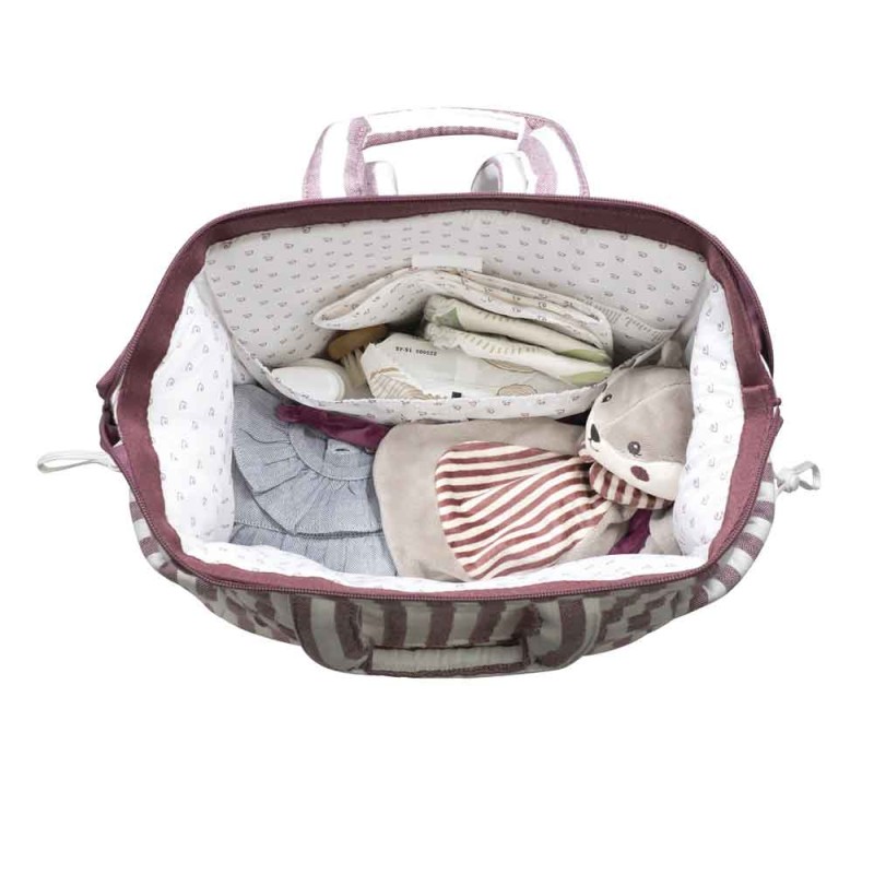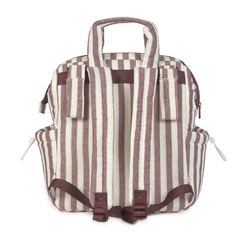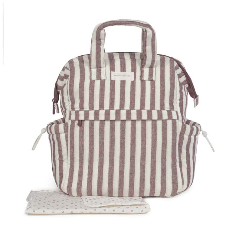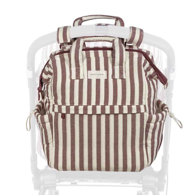 Mochila Cherry Rayas de Pasito a Pasito: práctica y elegante, con diseño de rayas. Ideal para organizar todo lo necesario del bebé y llevarlo cómodamente en paseos, viajes o uso diario.