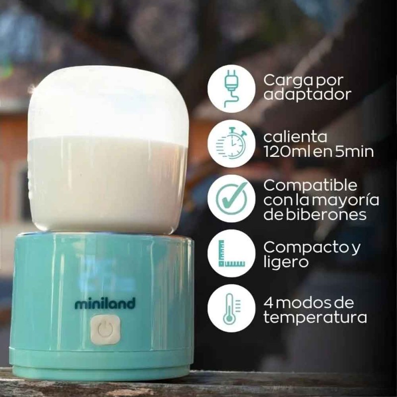 Ref: 89640El Warmy On The Go de Miniland es un calientabiberones portátil y recargable que permite calentar leche sin agua, ideal para viajes y salidas con tu bebé.