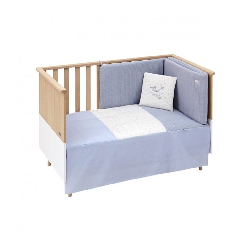 Juego de 2 piezas para vestir la cuna, compuesto por colcha invierno/verano más protector. Incluye un bonito cojín bordado.