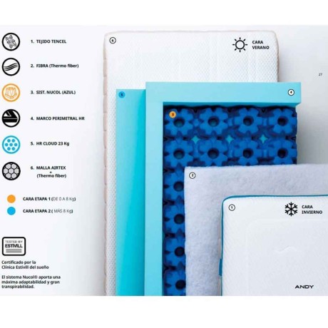 El colchón de cuna Andy My Baby Mattress está formado por un soporte de descanso de viscoelástica que ofrece un gran nivel de transpiración, adaptabilidad y la resistencia necesaria para que el reparto de peso del bebé se produzca de manera uniforme.