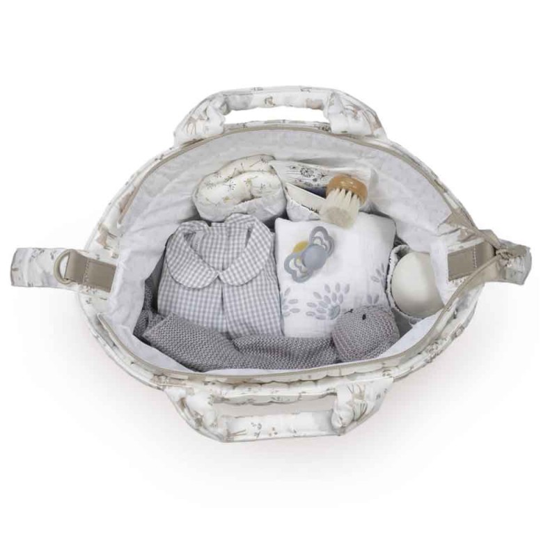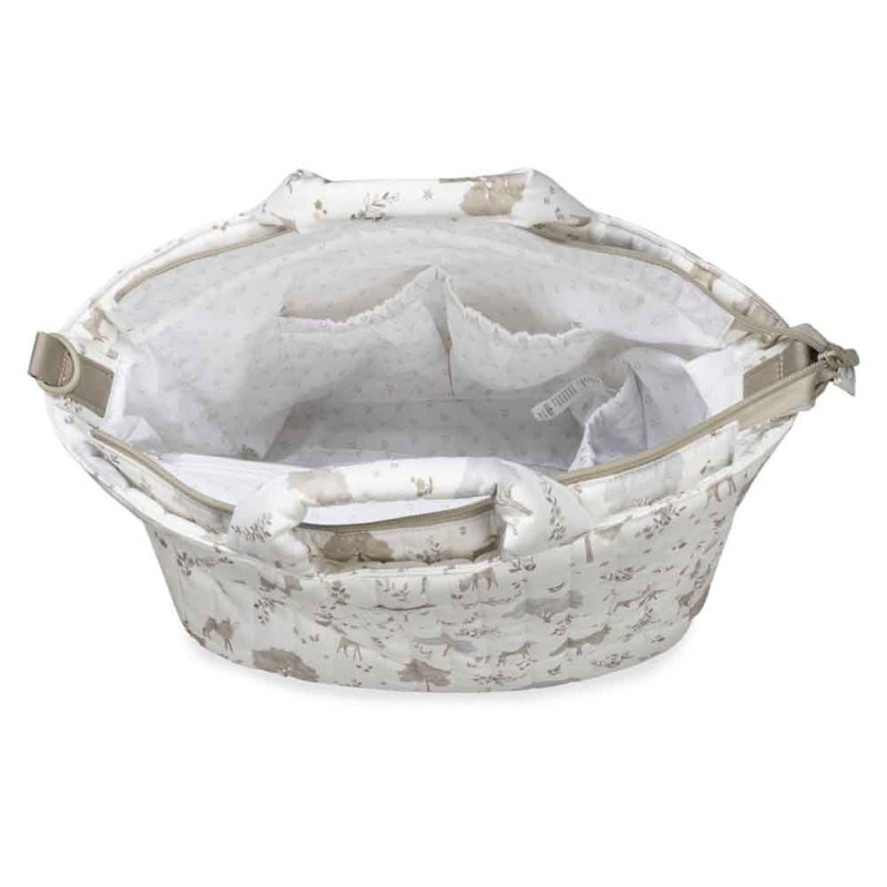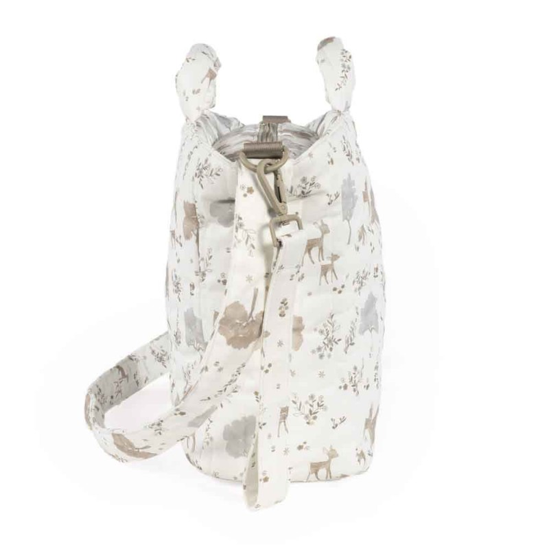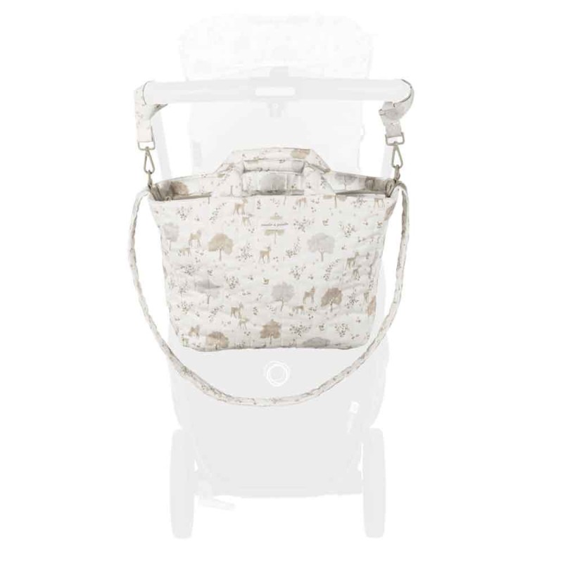 La bolsa para carrito de bebé o silla de paseo Icon es un modelo único, elaborado en loneta de algodón 100% con un delicado estampado de ciervos y árboles en tonos neutros