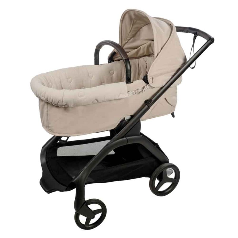 El cubre cuco con vuelta y sábana bajera ajustable Sintra beige con corazones bordados es el complemento perfecto para aportar suavidad y elegancia al capazo de tu bebé.