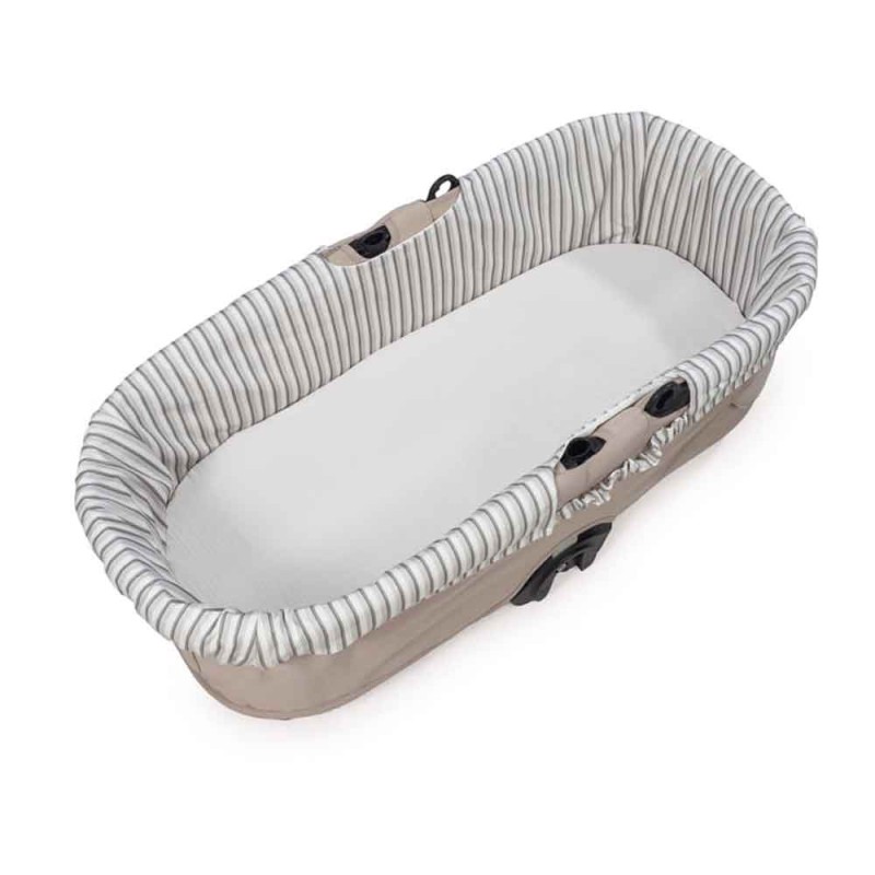 El cubre cuco con vuelta y sábana bajera ajustable Botton con estampado a rayasl es el complemento perfecto para aportar suavidad y elegancia al capazo de tu bebé.