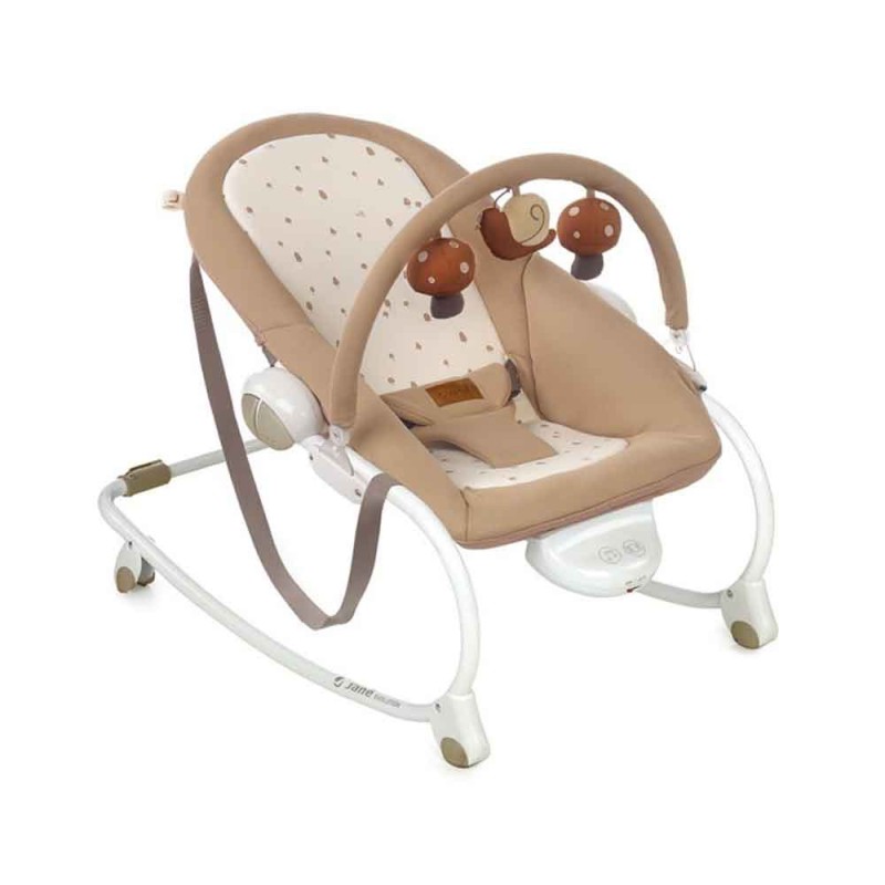 Hamaca Jané Evolution: respaldo multiposición, vibración y melodías, tapizado acolchado y lavable, arco de juegos y plegado compacto. Apta desde recién nacido hasta ~9 kg, ideal para descanso y entretenimiento diario.