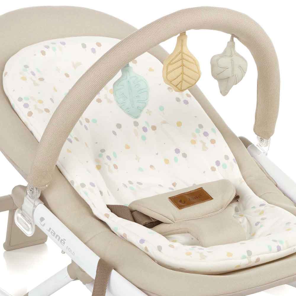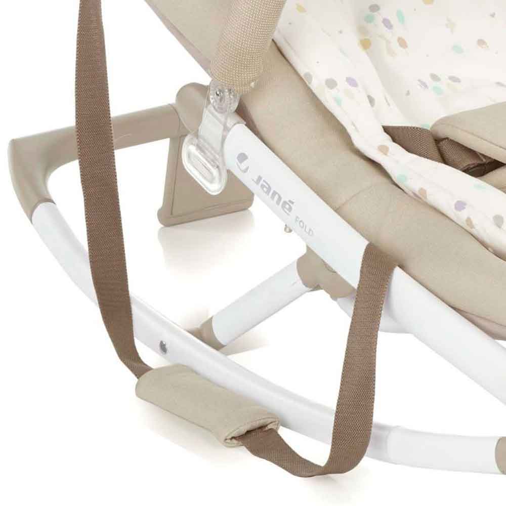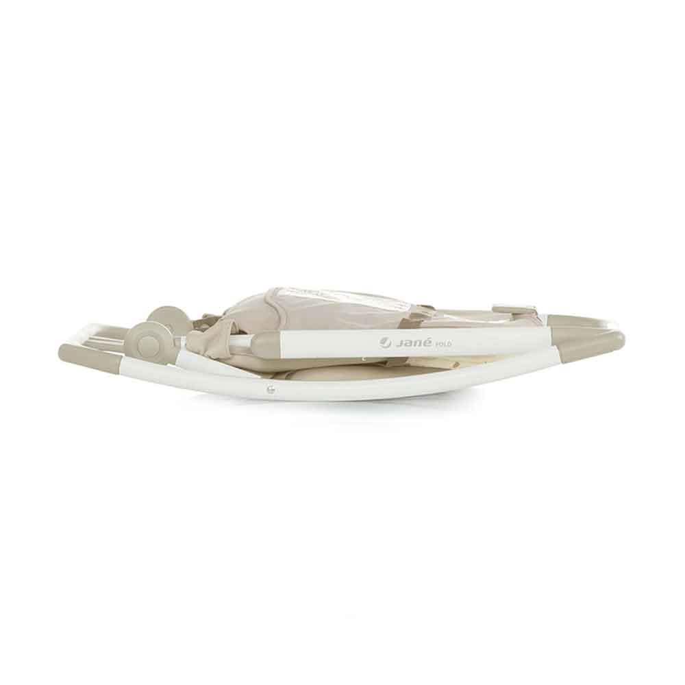 Hamaca plegable Jané Fold 2: ligera, compacta y confortable. Chasis de aluminio, tapizado acolchado desenfundable, respaldo reclinable y reductor envolvente. Ideal desde recién nacido hasta ~9 kg, perfecta para descanso, juego o viajes.