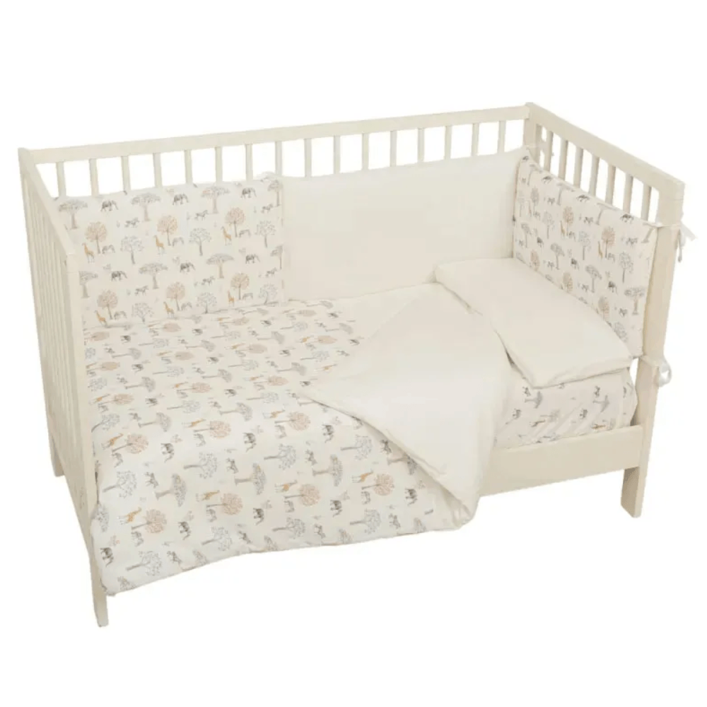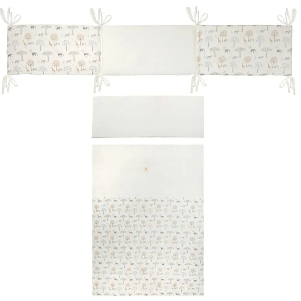 El Set Bimbi Tanzania 110x155 cm incluye funda nórdica, protector y funda de almohada, ofreciendo un conjunto completo para vestir la cuna o cama infantil con suavidad, confort y un diseño alegre.