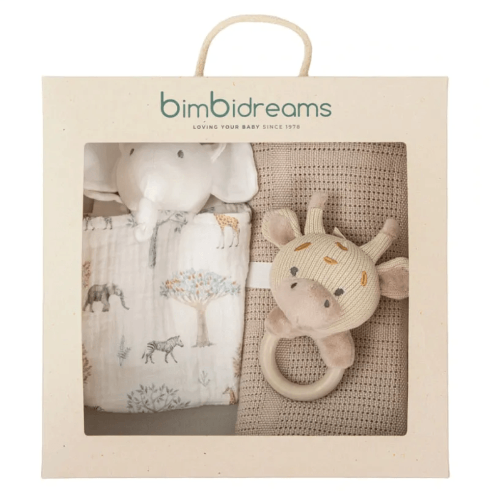 El Set Bimbi Tanzania incluye una manta de viaje y un juguete, pensado para acompañar al bebé en sus momentos de descanso, paseo y juego. Un conjunto práctico, suave y perfecto para el día a día o para regalar.