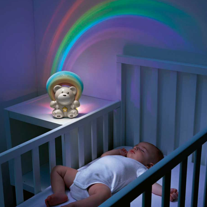 El Osito Arcoiris es un proyector luminoso que emite en la pared o en el techo de la habitación del bebé la figura de un arcoíris acompañado de música plácida y relajante.