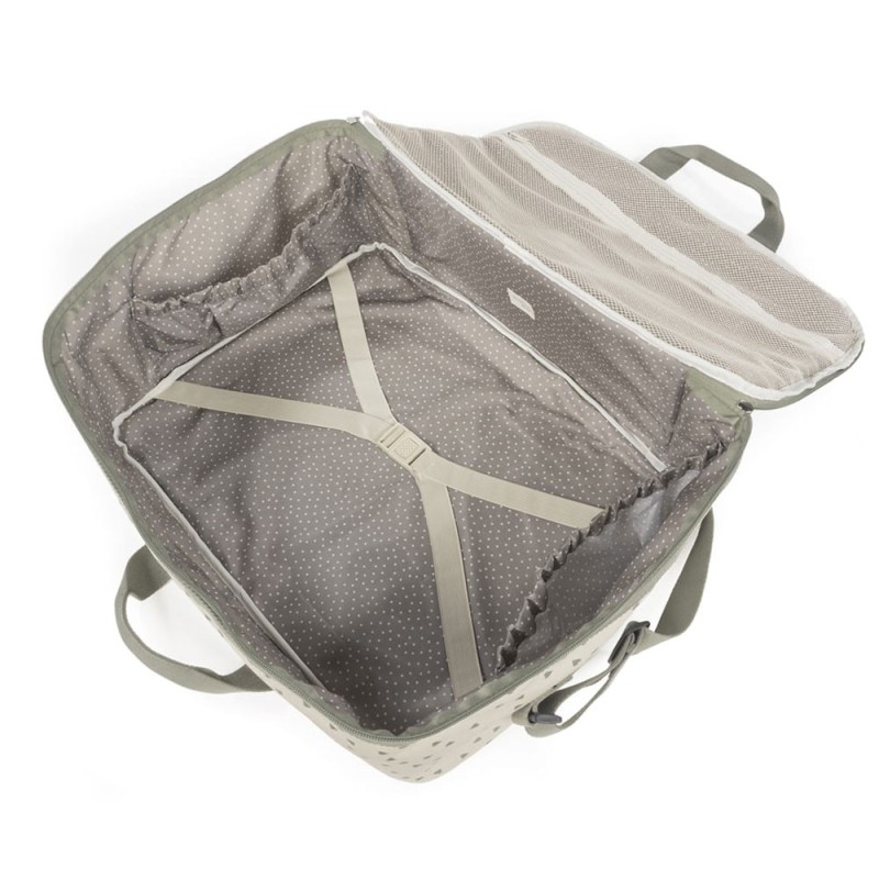 - Cuenta con cierre seguro de cremallera en ambas direcciones que facilitan su apertura, una correa larga para llevar colgada en el hombro y asas cortas de mano y un forro a juego en el compartimiento interior con gomas para contener la ropa y mantener todo en su lugar.