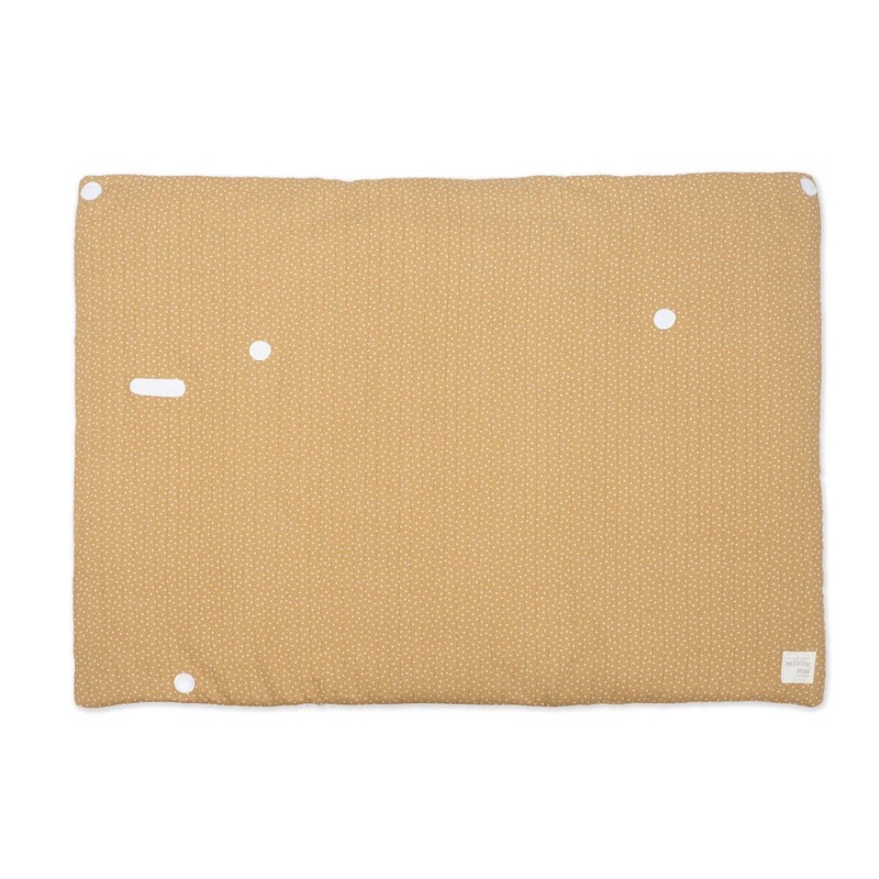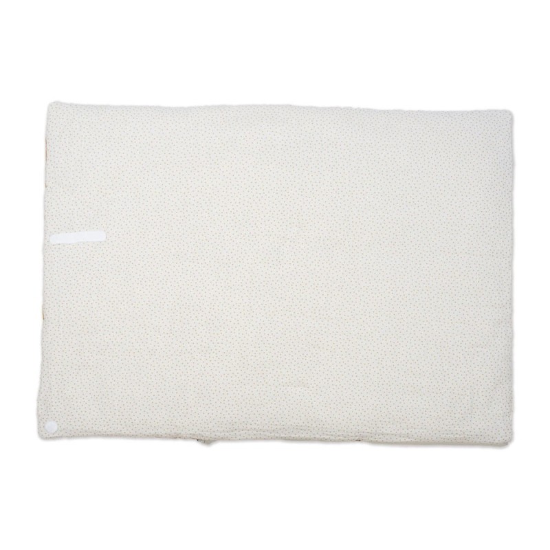 Saco arrullo o saco manta Poppy Canela de topitos. Está fabricado con un tejido exterior 100% algodón reciclado y una suave muselina en el interior 100% algodón.