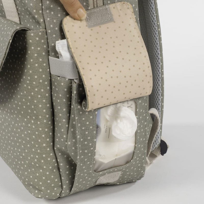 - Incluye un cambiador a juego con el bolso de maternidad y un bolsillo plastificado para almacenar la ropa mojada y aislar la humedad del resto de la mochila, 2 asas cortas ajustables que facilitan la colocación en cualquier modelo de silla de paseo, asas de mano y correas acolchadas para colgar en los hombros hacia la espalda, sin generar molestias por el peso.