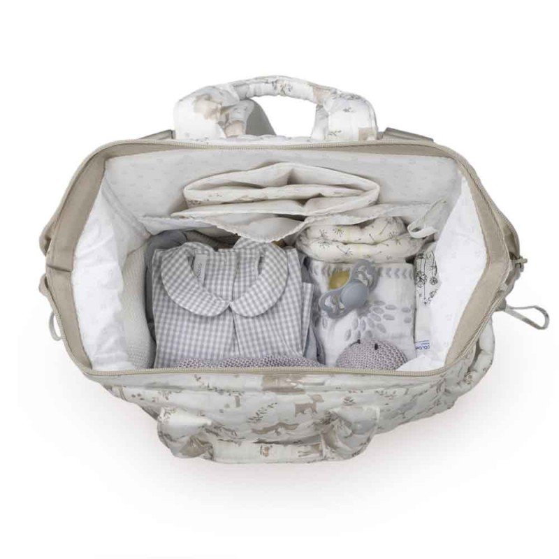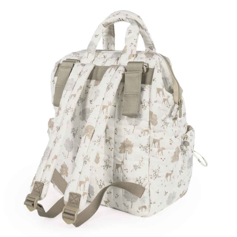 Descubre la mochila maternal Nara de Pasito a Pasito, confeccionada en loneta de algodón 100% con un delicado estampado de ciervos y árboles en tonos neutros.
