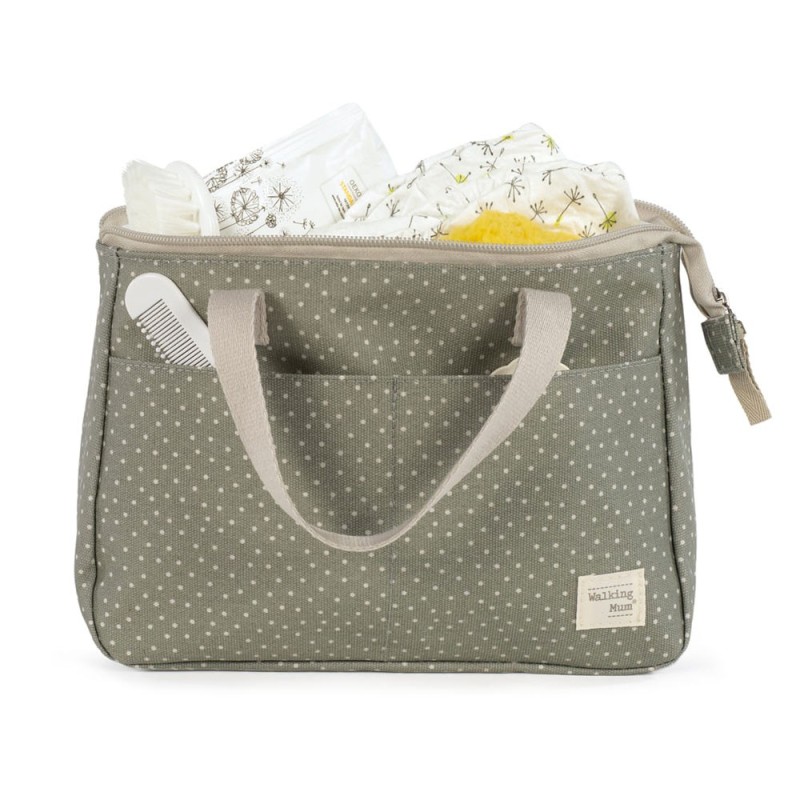 El neceser de bebé Poppy Musgo de topitos es un bolso especialmente pensado para llevar todos los productos de aseo de nuestra niña o niño al salir de casa.