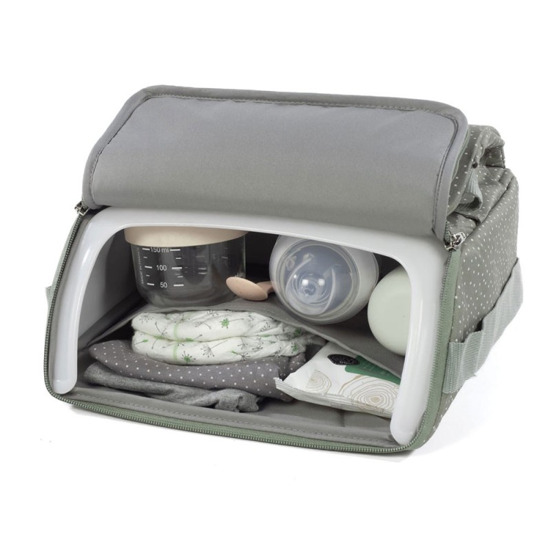 - Cuenta con una correa para llevarla cómodamente al hombro. Incluye un compartimento de almacenamiento en la base, perfecto para guardar pañales, toallitas u otros accesorios esenciales del bebé.